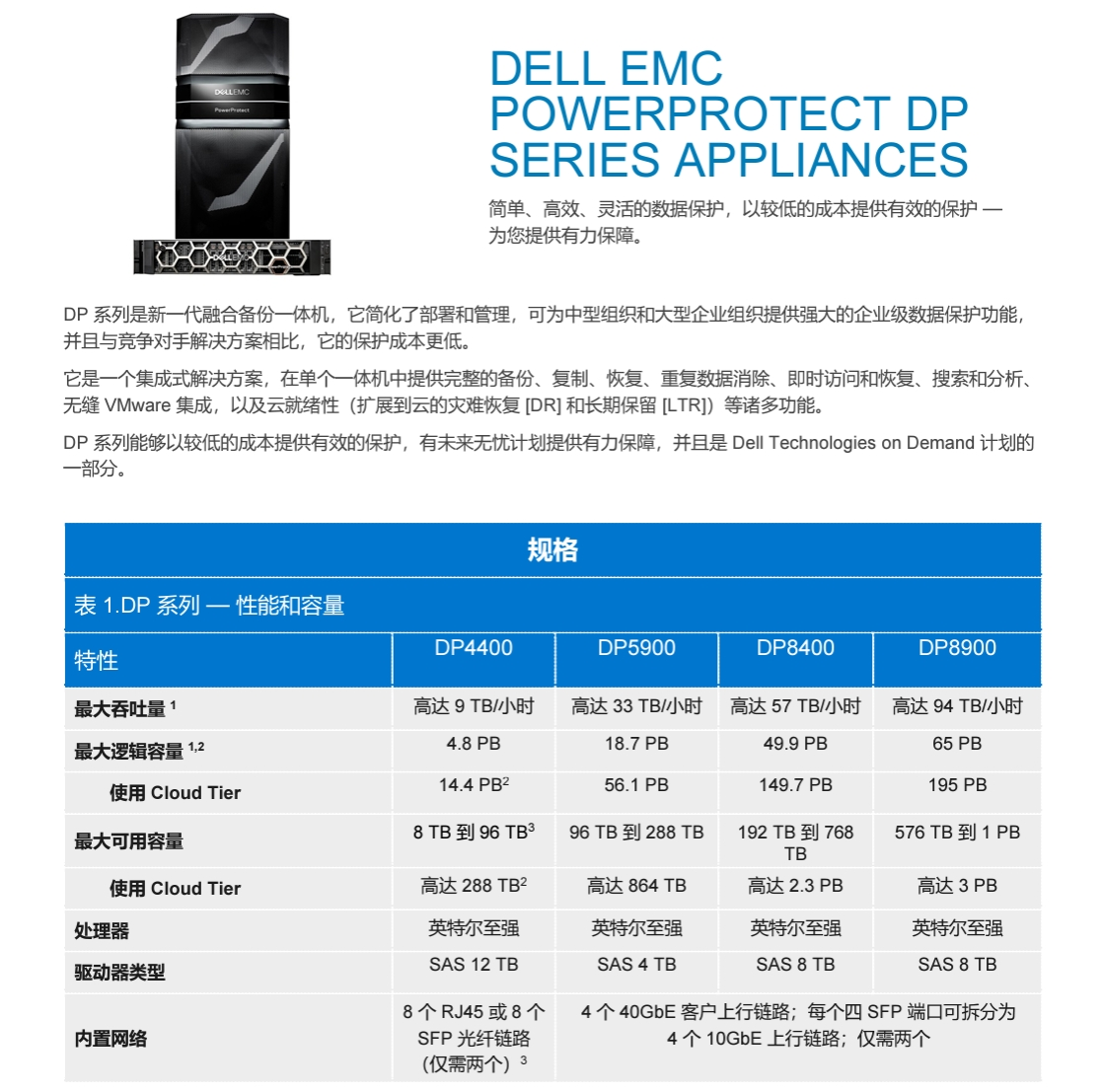 PowerProtect DP 系列备份一体机是 PowerProtect 数据保护存储设备产品组合中的集成式设备解决方案。